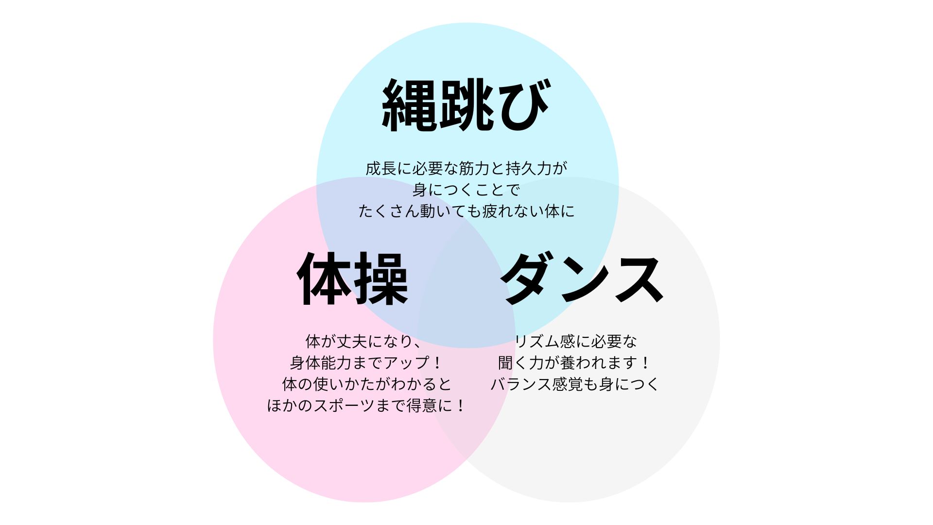 ダブルダッチは、ただの縄跳びではありません。「探してもなかなか見つからない?!」と言われるほど珍しい、【縄跳び】【体操】【ダンス】の3つの要素を同時に学べるハイブリッドスポーツです。
